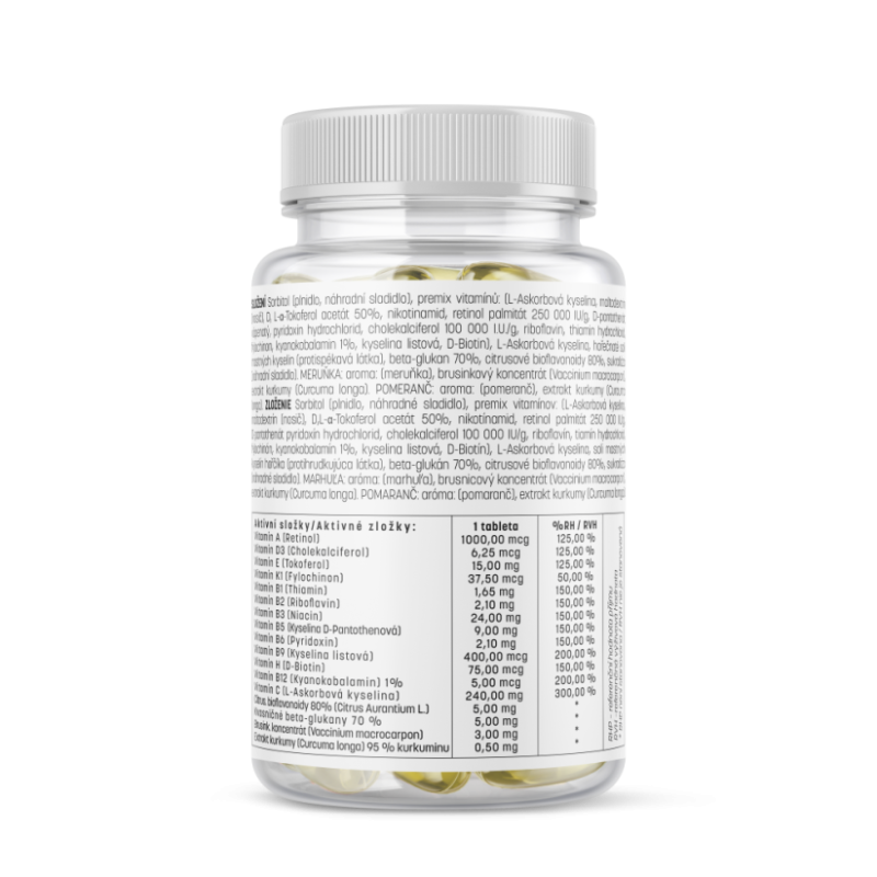 Sorbitol, Vitamin Premix: (L-Ascorbic Acid, Maltodextrin, D,L-α-Tocopherol Acetate 50%, Nicotinamide, Retinol Palmitate 250,000 IU/g, Calcium D-Pantothenate, Pyridoxine Hydrochloride, Cholecalciferol 100,000 I.U./g, Riboflavin, Thiamine Hydrochloride, Phyloquinone, Cyanocobalamin 1%, Folic Acid, D-Biotin), L-Ascorbic Acid, Flavor: (orange), Magnesium Salts of Fatty Acids (anti-caking agent), Beta-Glucan 70%, Citrus Bioflavonoids 80%, Sucralose (sweetener), Turmeric Extract (Curcuma longa)